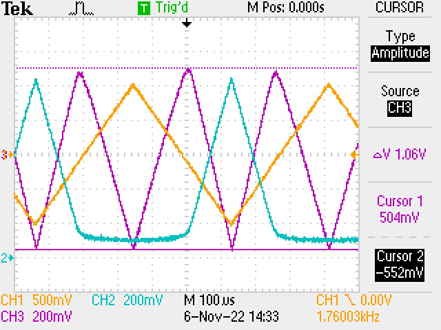 The input signal was calibrated to swing 2V down from +6V, to allow use of the precision 6V temperature stable LM3900 voltage reference circuit, such as in a VCO. The LM3900 output easily swings 2V at any DC voltage within output compliance on a wideband basis, and with extremely little phase shift.